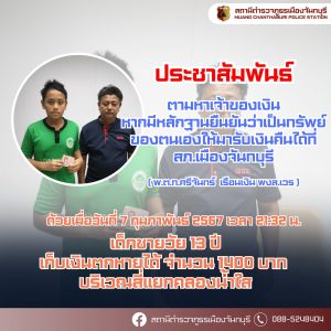 ประกาศประชาสัมพันธ์ ด้วยเมื่อวันที่ 7 กุมภาพันธ์ 2567 เวลา 21:32 น. ได้มีเด็กชายสงกรานต์ทองย้อย อายุ